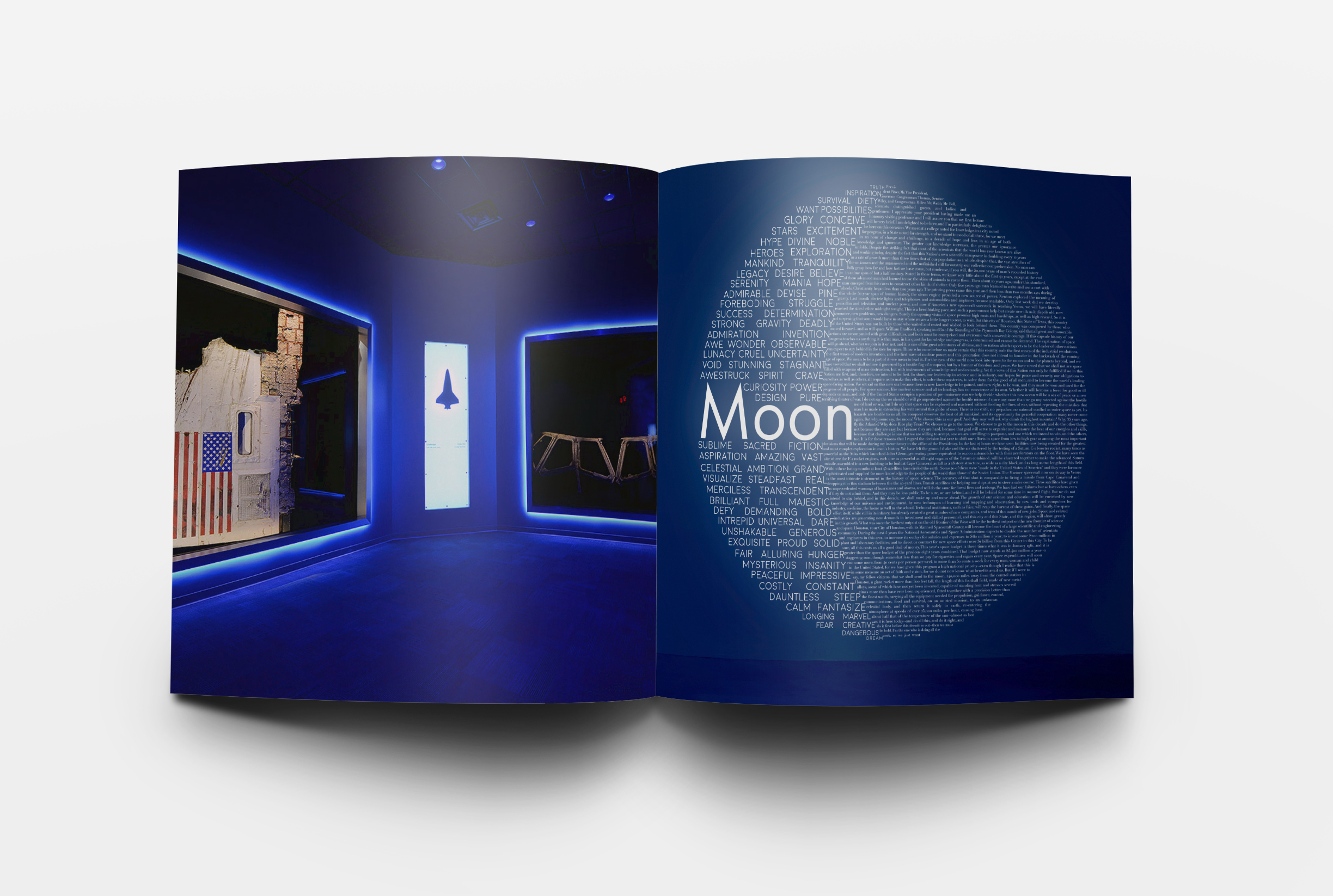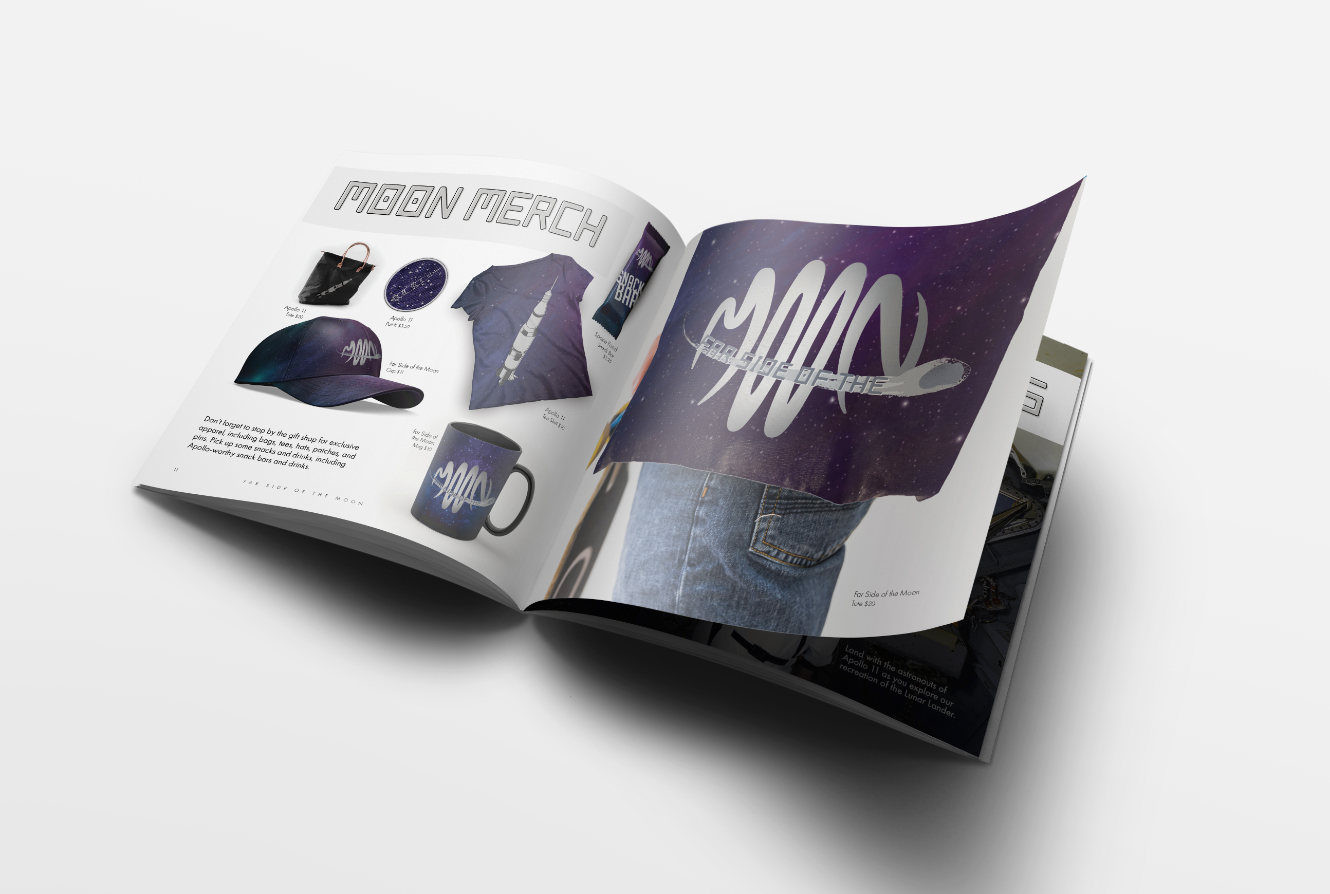 This fictional museum exhibition is a display of the history of Moon travel. It displays typographical elements such as a logo, word wall, and typesetting. To make it authentic, merchandise was mocked-up and there are more elements placed into the setting of the would-be exhibit.