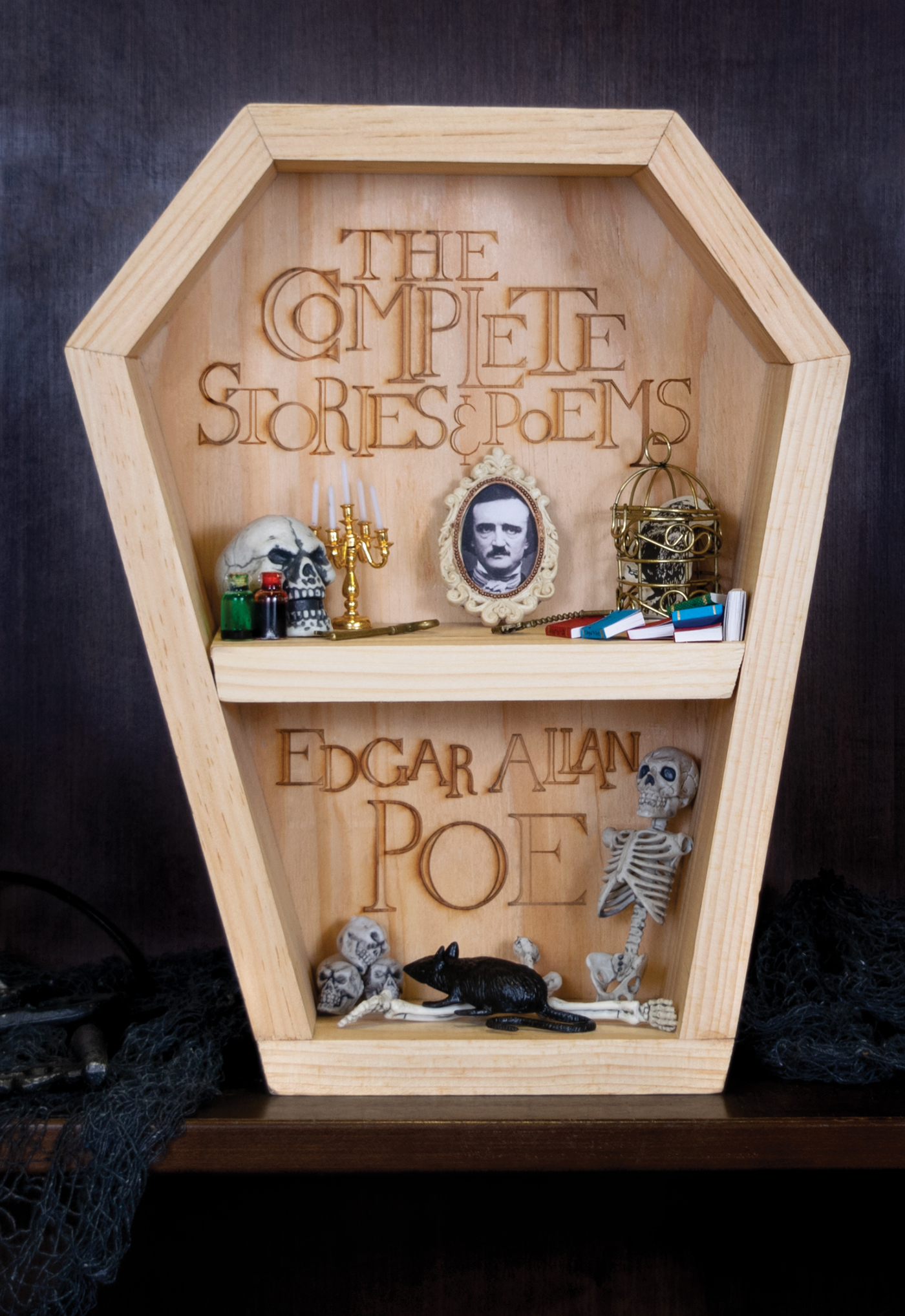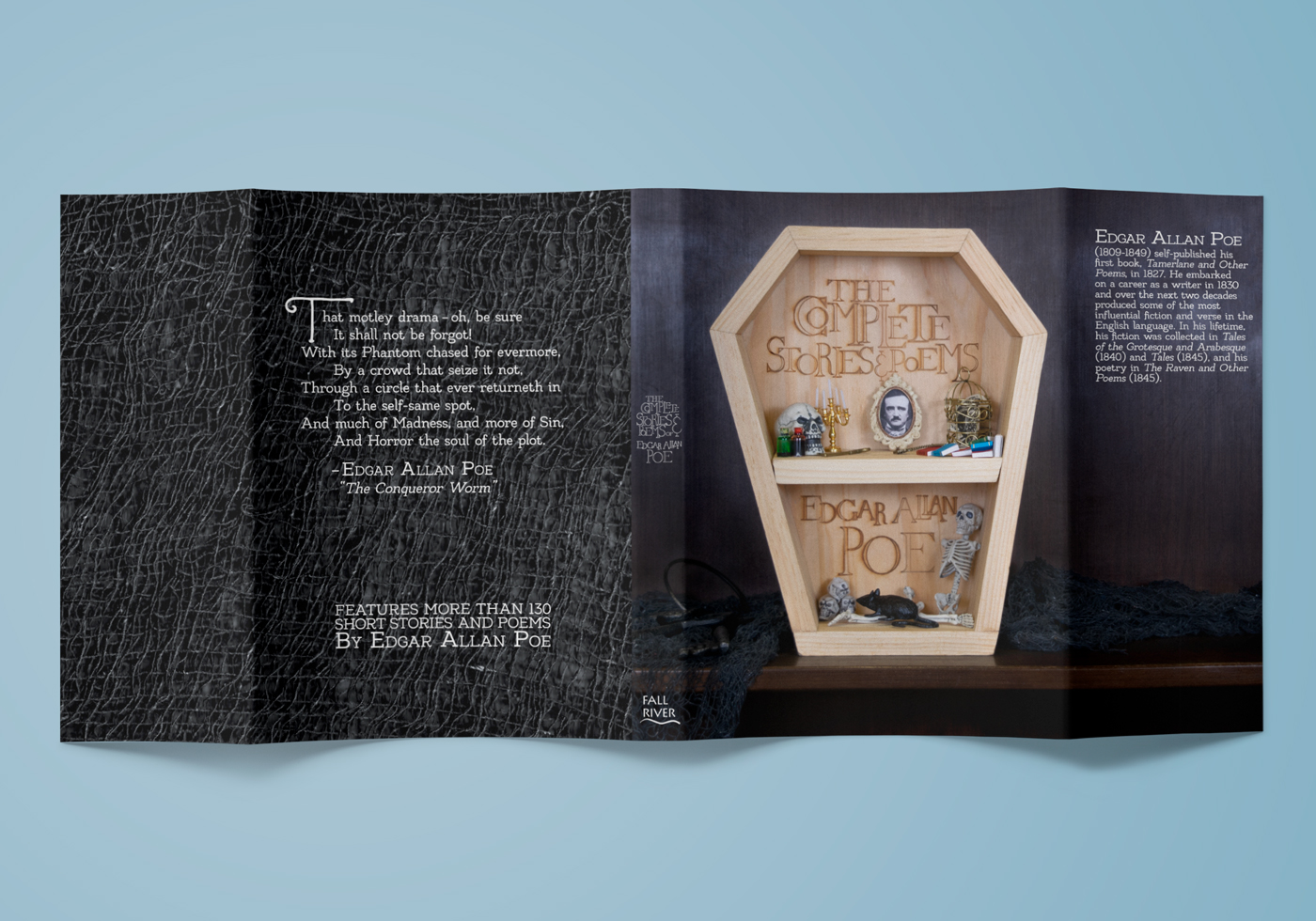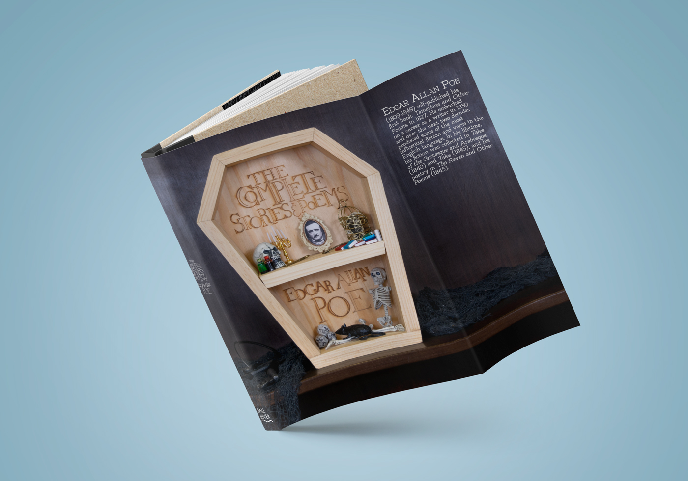 This piece includes a hand-built pine casket with a shelf and laser-etched hand lettering for the title, photographed and edited to represent a dust cover for the Complete Stories and Tales of Edgar Allan Poe. The lettering was created to encompass traditional horror titles to fit the theming of this thriller author.