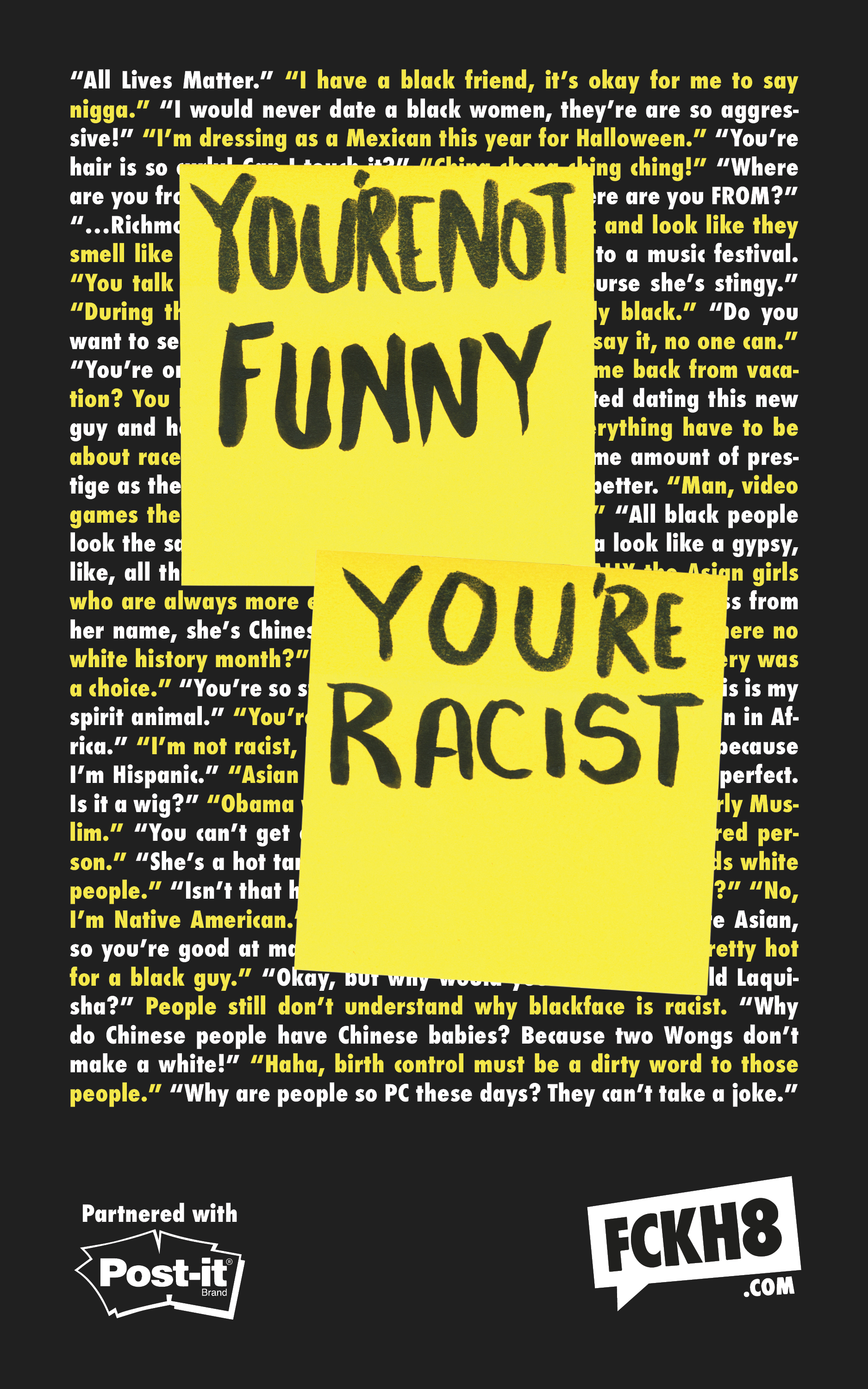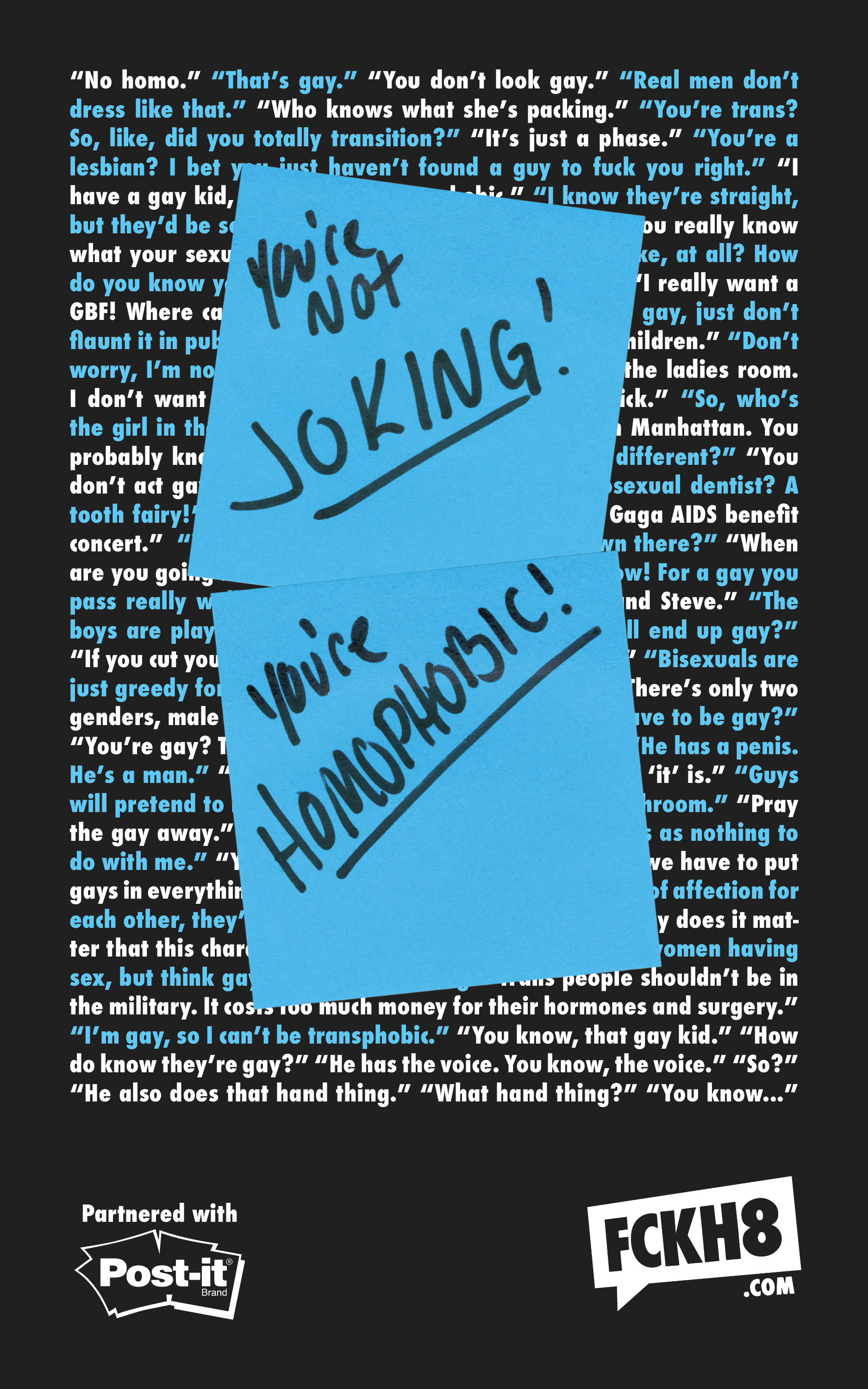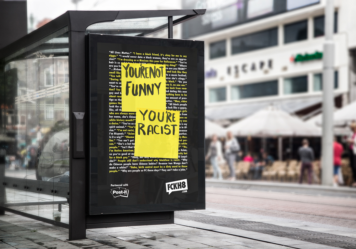 Racism, homophobia, and sexism run rampant in our world (that’s right--even still in 2019!). It’s up to us to end that hate. Together, FCK H8 and Post-it team up to create transit posters that both inform and propose your casual hate is still hate. Just because you have a black friend doesn’t mean you can use the “N” word. When you get too familiar with your male friend and you throw your hands up, crying, “No homo!” you’re perpetuating that it’s not okay to be gay. When a woman gets angry, it doesn’t mean she’s on her period.