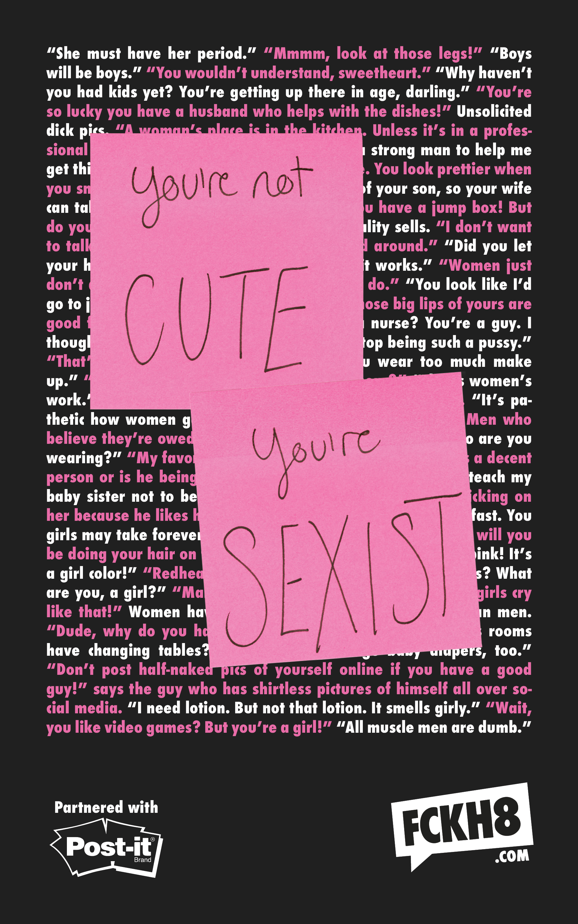 In the transit ads, there is a compiled list of casual comments people might not believe are an issue, but deeply affect how others are viewed in our society. On top, Post-It notes are slapped down to demand the point that “You’re not being cute, you’re being sexist” or that racism ISN’T funny.